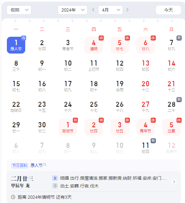 4月4日(星期四)至4月6日(星期六)連休3天,4月7日(星期日)因調(diào)休正常上班。